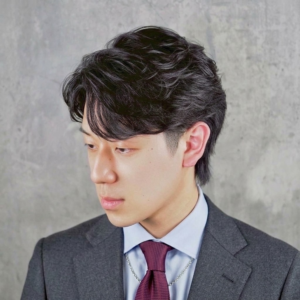 センターパートやマッシュとの相性が良く、落ち着いた大人の雰囲気に仕上がります。