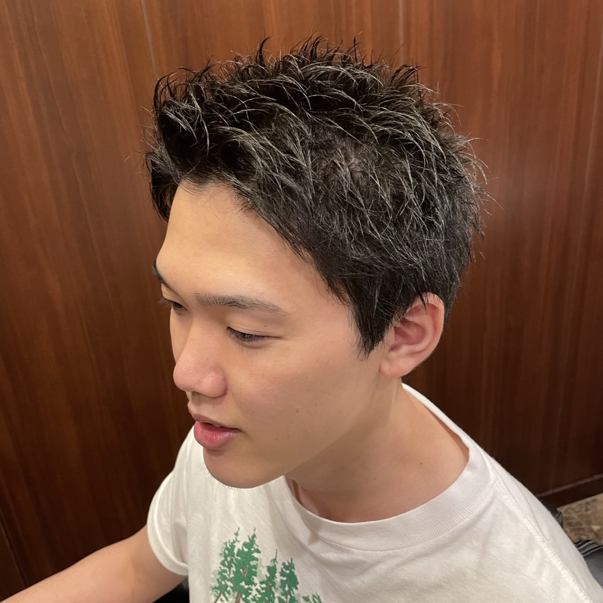 トップに動きを出し、毛先を立たせやすくしたスタイルです。短髪でも軽さが出るため、朝のセットが簡単なのが特徴です。