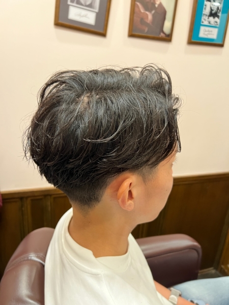 スパイラルパーマかけられてる方で、耳元をスッキリ出して、ツーブロックも短めの3mmを使ってるので、締りがよく男らしく見えます。