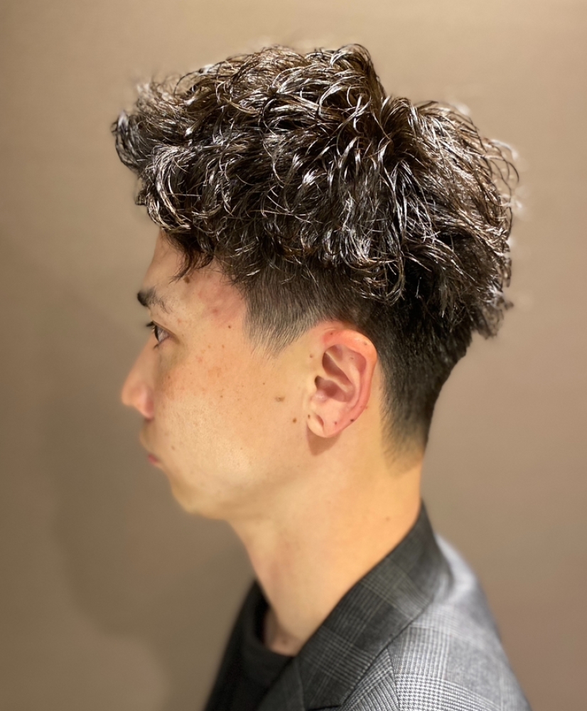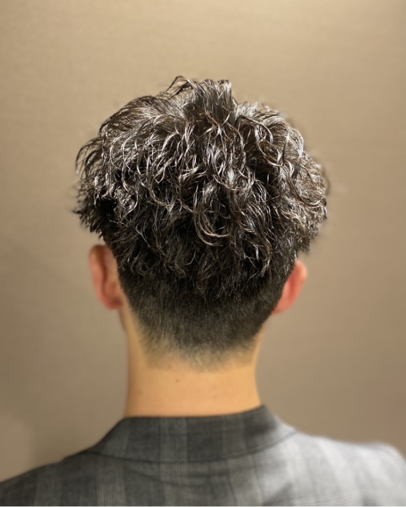 メリハリのあるツーブロックにスパイラルパーマを合わせることで、清潔感を残しながらも程よいラフさをプラス。スタイリング次第で、ビジネスシーンからオフの日のカジュアルスタイルまで幅広く楽しめます。