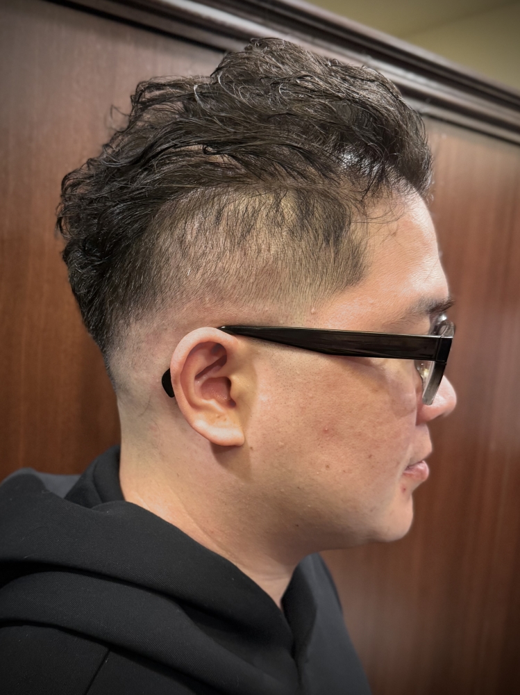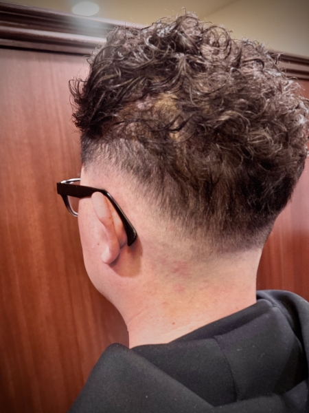 スキンフェードの刈り上げと、パーマで動きをつけて清潔感と漢らしさを。