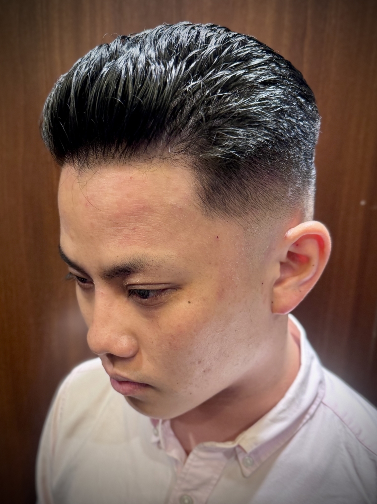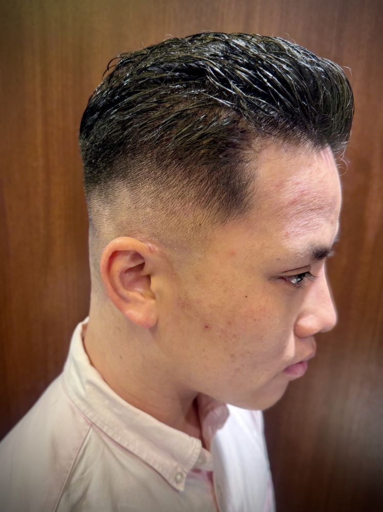 周りは刈り上げてスキンフェードを入れて、バックに流せるぐらいに短くしました。
