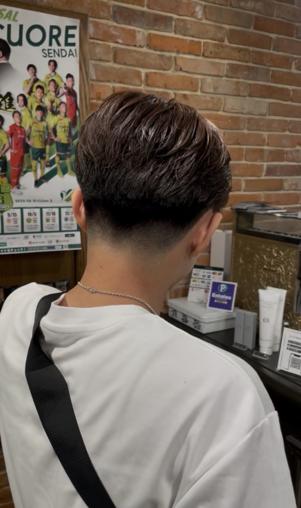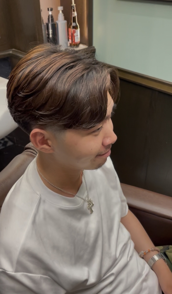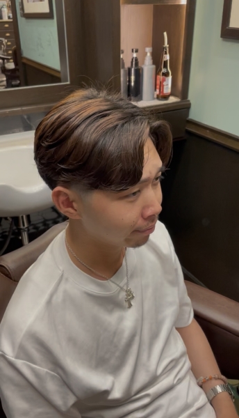 - 根元を立ち上げて毛流れに沿ってドライし、前髪〜トップに軽くワックスをなじませて分け目の陰影と束感を整えます