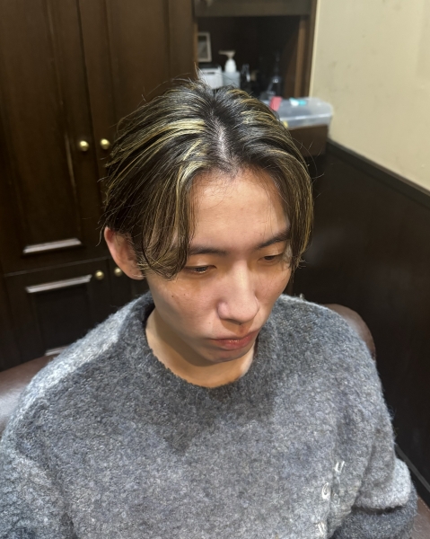 センターパートに細めのメッシュを入れて、動きと立体感をプラス。