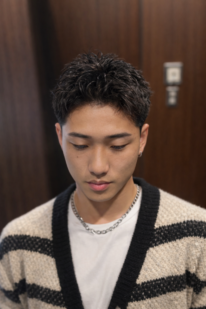 横は刈り上げでスッキリさせ、頭のシルエットをコンパクトに見せます。
