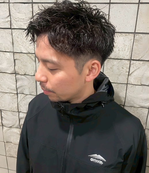 全体にしっかり動きが出るようにツイストを加えつつ、スパイラルで立体感をプラス。無造作な質感が出るので、セットもかなり楽になります。サイドと襟足はすっきりさせているので、清潔感もあり大人っぽい印象に。