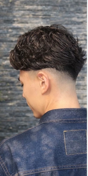 全体にラフで無造作な動きをつけたゆるめのカールが特徴で、抜け感と男らしさを両立させたナチュラルなパーマスタイルです。