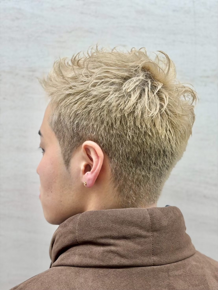 ブリーチベースのハイトーン×短髪×パーマスタイル。