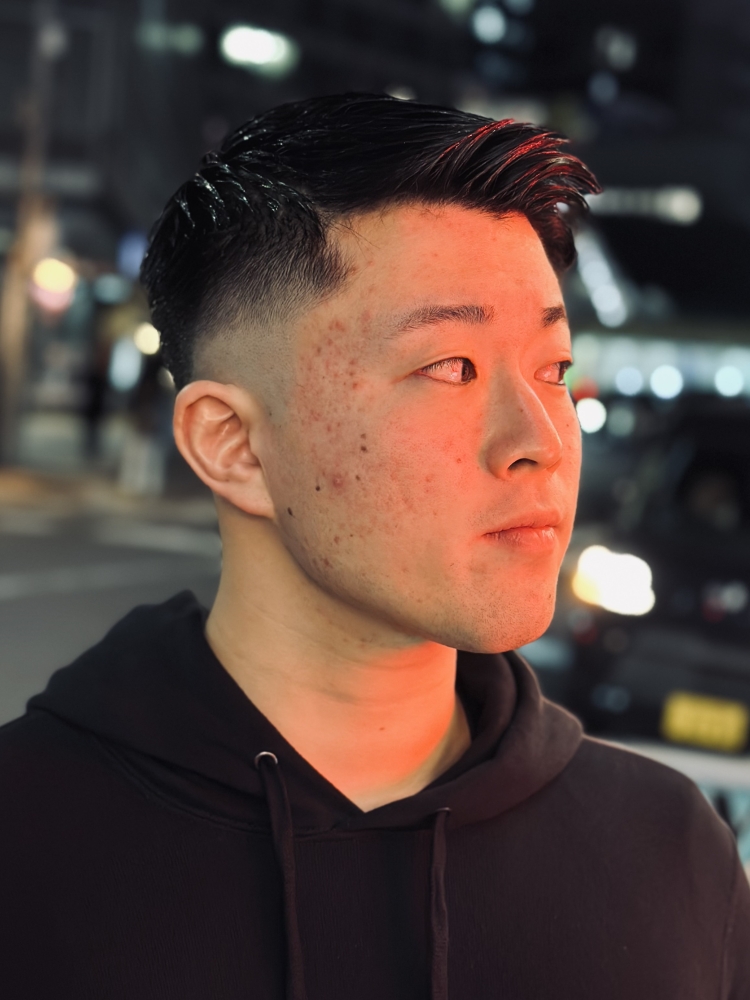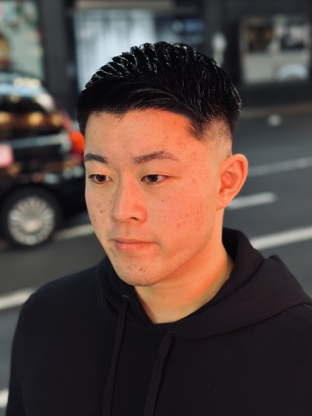 スキンフェード×フェザーアップ、すっきりとした高めのグラデーションで、トップはセットしやすいよう軽く仕上げてあります!
