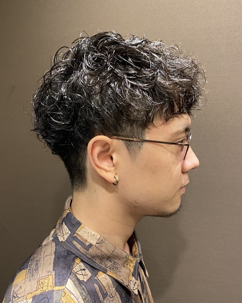 スパイラルパーマでしっかりとした動きと立体感を出した、ツーブロックショートスタイル。