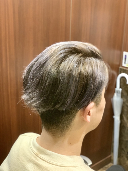 ツーブロックでセンターパートや7:3にも分かれるぐらいの長さです!セットで自在に変更可能!カラーがメッシュでブリーチ後にホワイトアッシュ、グレージュ、パープル系すべてメッシュでのせてあり、3色展開の立体感のあるハイトーンです!