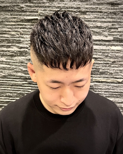 王道2ブロックショートスタイルです。メンズウケもレディースウケもバッチリ!前髪を上げると更に爽やかな印象に!ふんわりパーマをかけてるので、ワックスを軽く付けるだけで簡単にスタイリングできます!