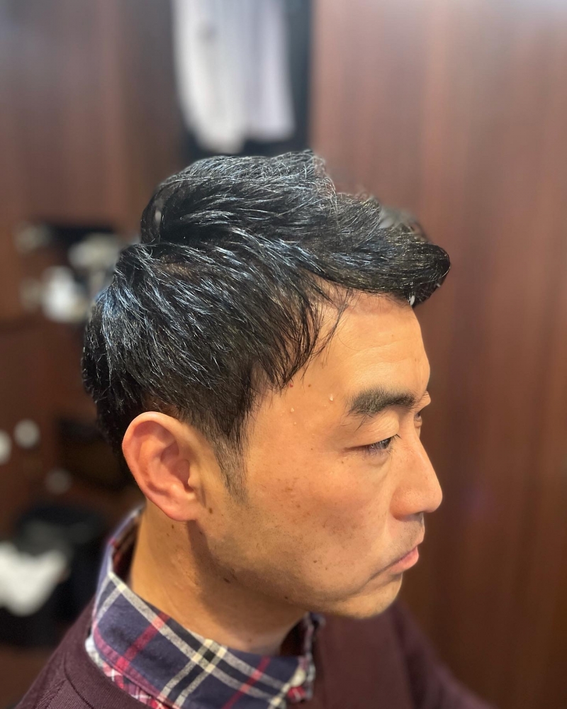 刈り上げないで耳周りをスッキリだし襟足もそれに合わせてスッキリとり前髪を上げる事で好印象スタイル