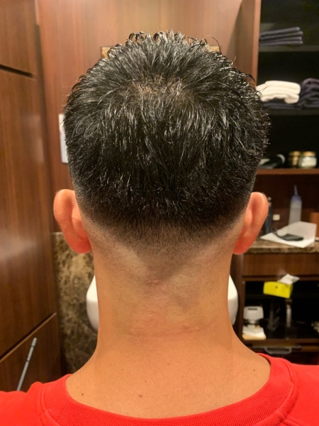 フェードを高めに入れさせていただいて、前髪に癖が出やすい方だったため、自然になじむようにグリースでセットさせていただきました。