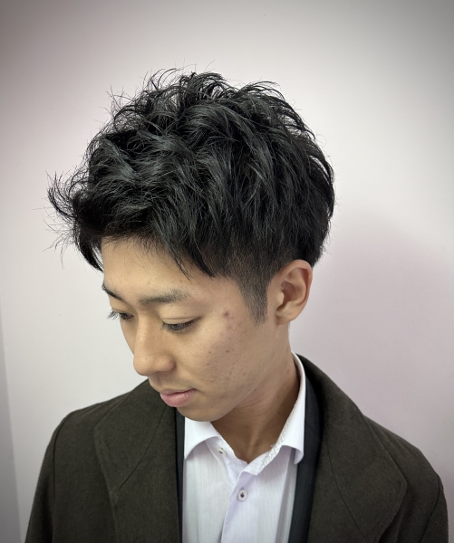 アップバング×ツーブロック×刈り上げスタイルです。梳き多めで簡単に束間セットできます!