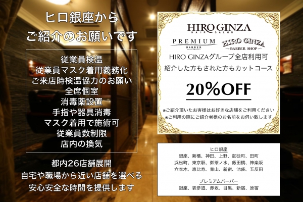 - いつもヒロ銀座のご利用誠にありがとうございます。ヒロ銀座からご紹介のお願いがございます。現在弊社ではコロナ対策として・従業員の検温・従業員のマスクの義務化・ご来店時お客様の検温協力のお願い・全席個室・...
