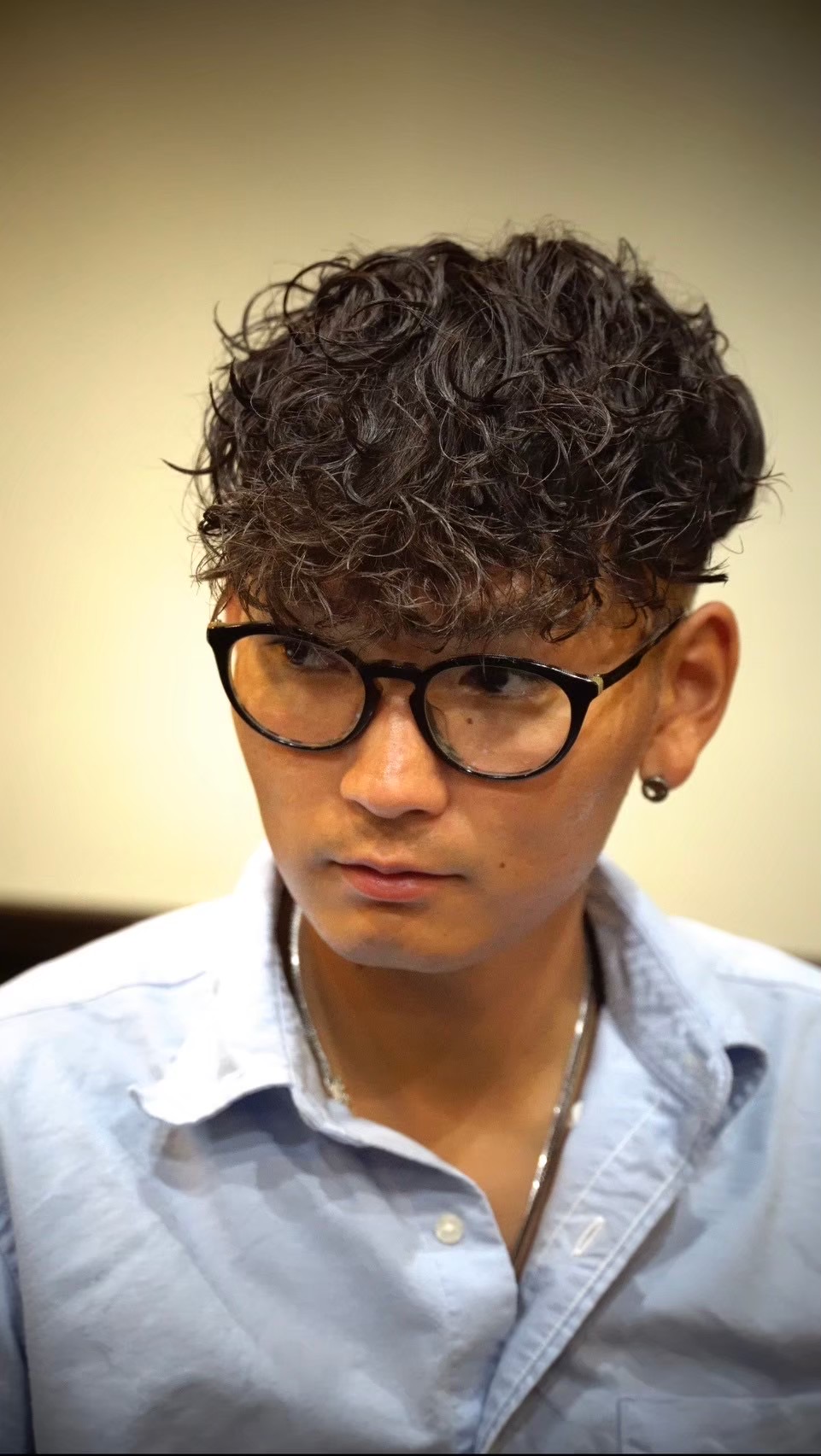 直毛では出しにくい柔らかさも、自然な動きを意識したカットとパーマで程よくコントロール。メガネにかかる前髪は重くしすぎず、目元がはっきり見える長さに設定しています。横や後ろはすっきりまとめることで、全体のバランスが取りやすく、オンオフ問わず使えるのもポイントです。
