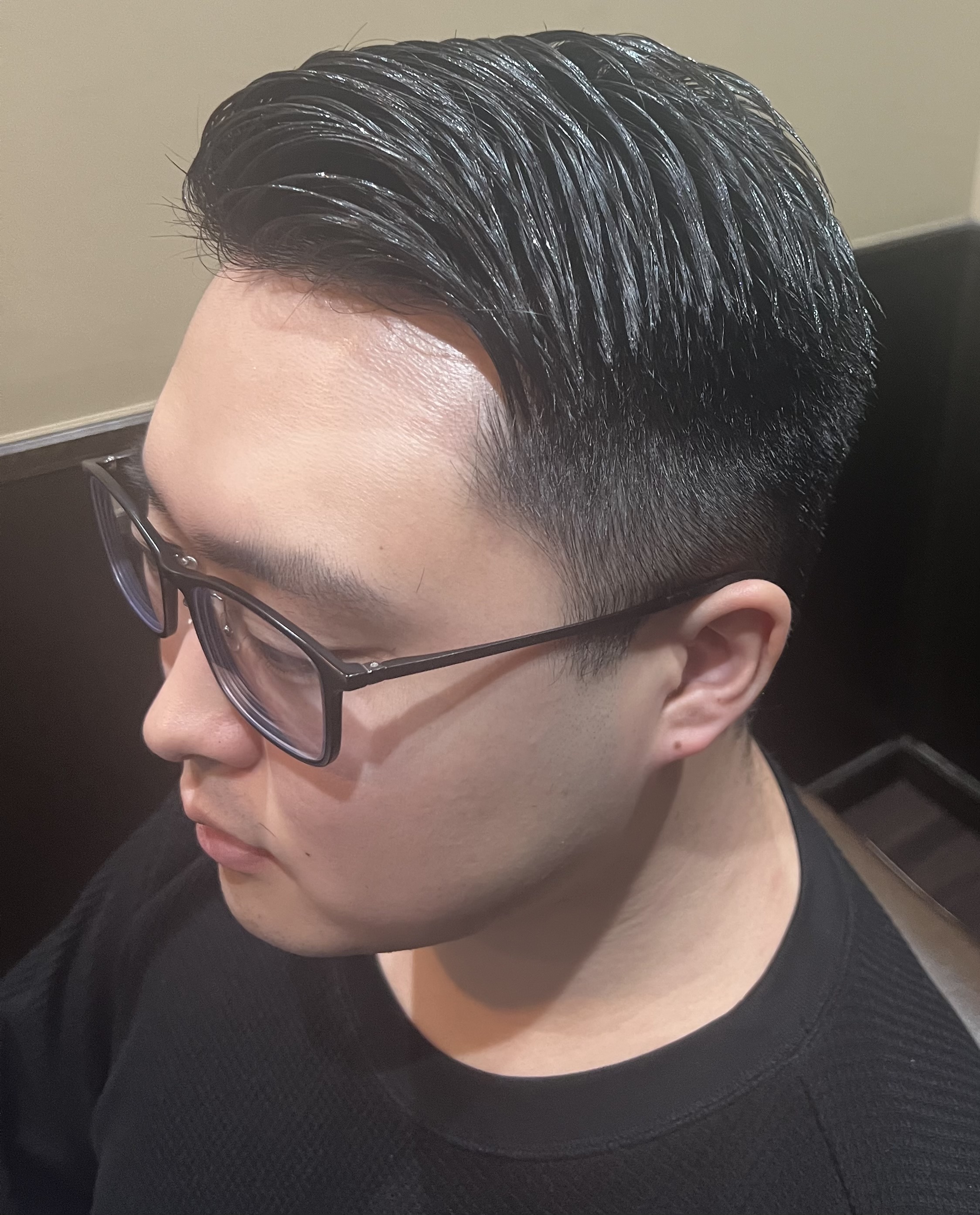 ビジネスサイドパートは、分け目をきっちりと作ることで清潔感と信頼感を演出する、王道のビジネススタイル。トップは自然な立ち上がりが出る長さを残し、サイドとバックはタイトに整えることで、全体をシャープなシルエットに仕上げます。顔立ちが引き締まって見えるのも特徴で、スーツやジャケットとの相性も抜群。スタイリングはドライ後にジェルやグリースをなじませ、分け目に沿って整えるだけで完成します。第一印象を大切にしたい方におすすめの、安心感のあるヘアスタイルです。