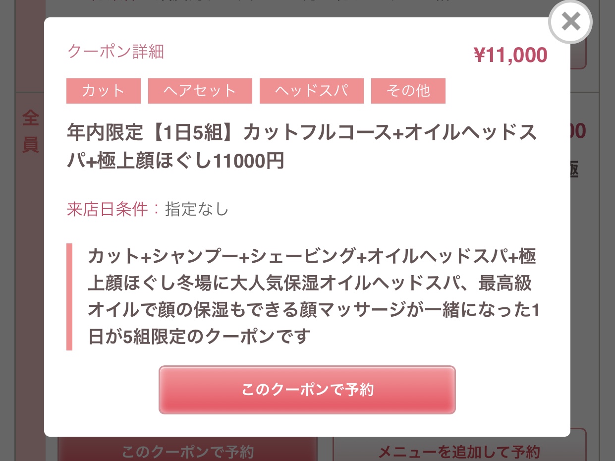 このクーポンではカット、シェービング、シャンプー、肩マッサージ、顔のマッサージ、ヘッドスパ