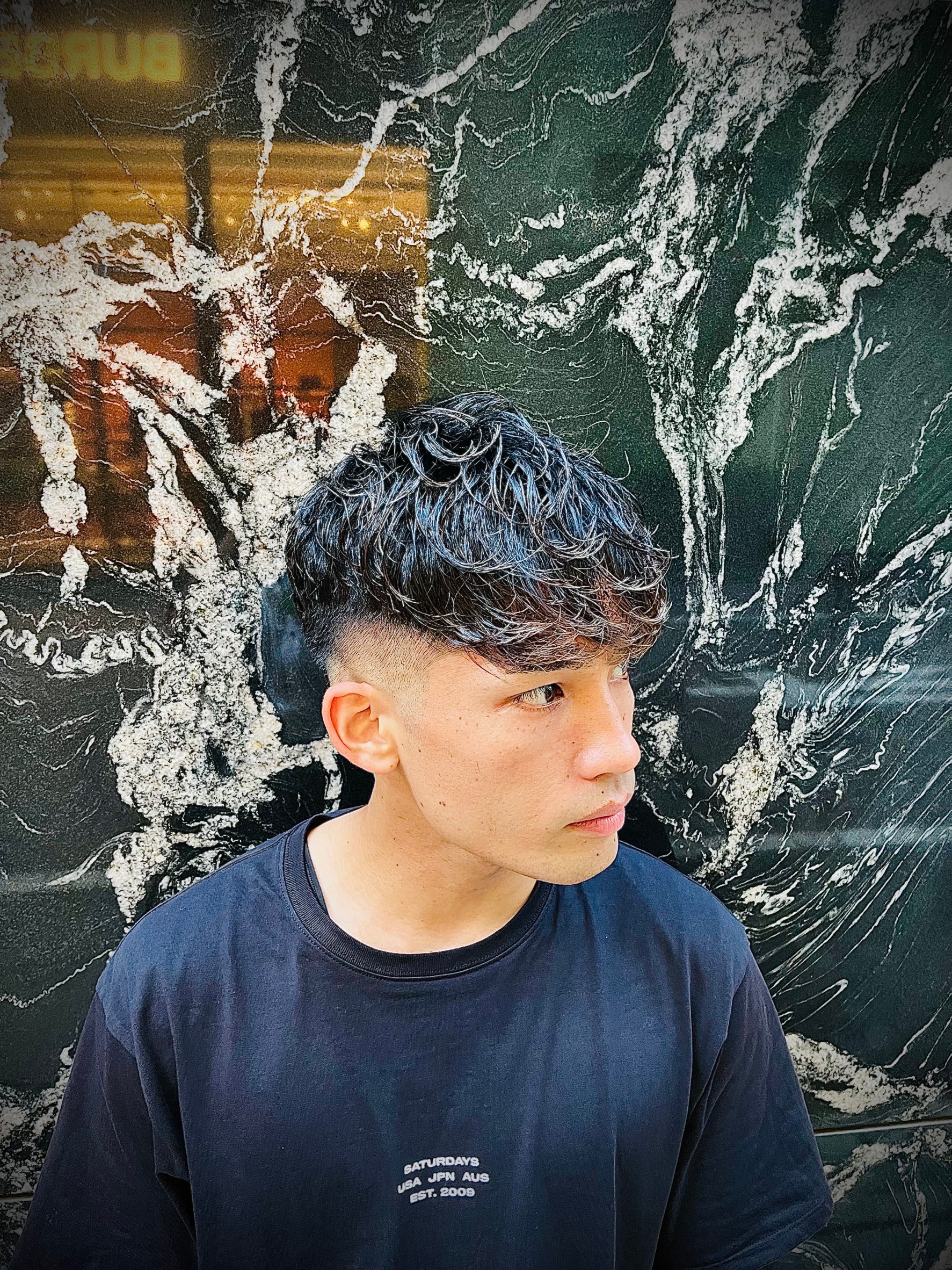 黒髪はビジネスにもプライベートにもなじむ万能カラー。そこに程よいパーマをプラスすると、硬く見えがちな印象に柔らかさと動きが生まれ、グッと垢抜けた印象に。さらにツーブロックでサイドを刈り上げれば、頭の形が美しく見え、清涼感もアップ。全体のバランスがとれた夏向けスタイルが完成します。