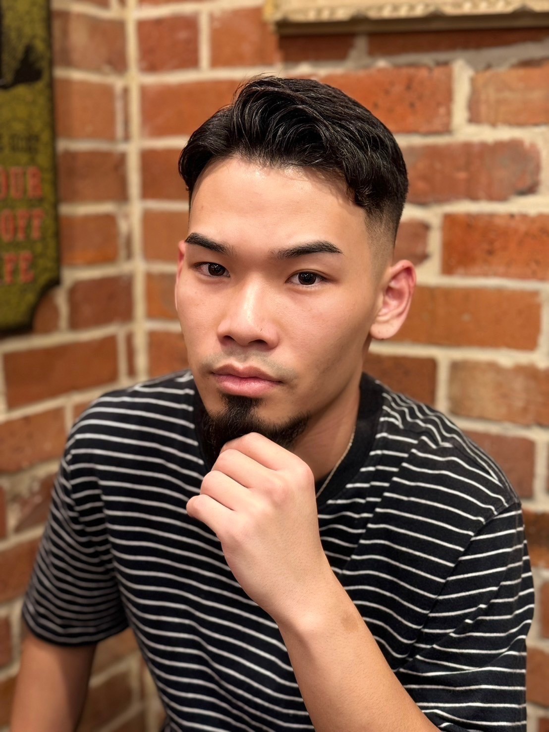 今回のフェードスタイルは、サイドからバックにかけてグラデーションで刈り上げ、トップはナチュラルに流れを持たせることで、硬派ながらも爽やかさを演出できます。スタイリング剤を軽くなじませるだけで形が整うので、朝の忙しい時間でも簡単に決まるのが魅力。ヒゲとの相性も抜群で、清潔感を保ちながらワイルドさをプラスしたい方にぴったりです。