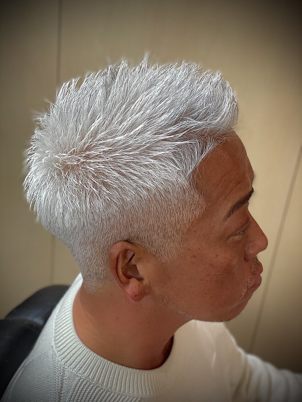 ホワイトショートは、髪のボリュームが気になり始めた方にもおすすめ。トップに自然な立ち上がりをつけ、サイドとバックをすっきり刈り上げることで、若々しく見せながらも落ち着いた雰囲気を演出します。カラーのムラが出にくく、グレーヘアを美しく見せるのもこのスタイルの魅力。朝のセットも簡単で、ワックスやバームを軽くなじませるだけで一日中キープできます。