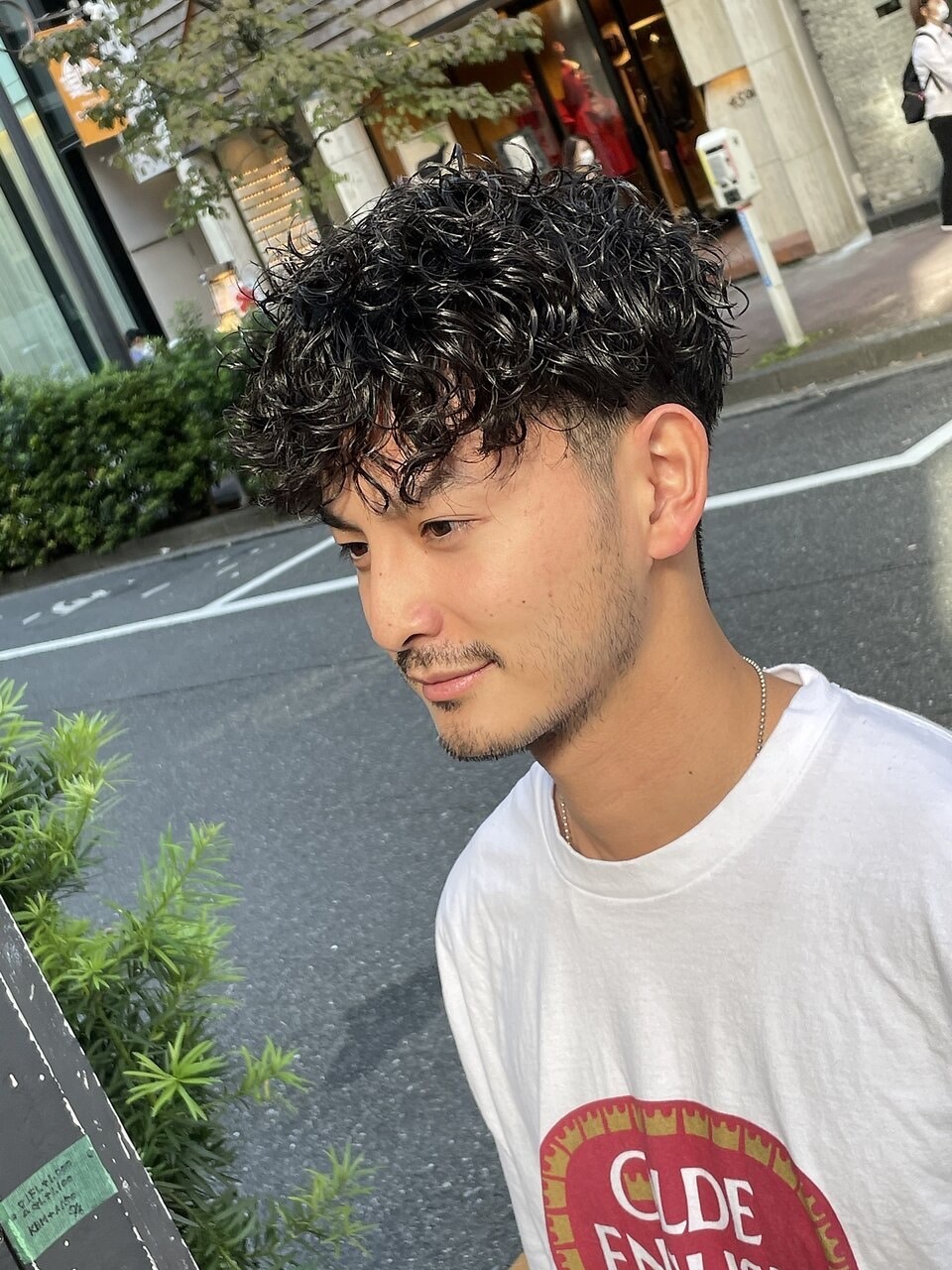 今回のスタイルは、全体をゆるめのスパイラルで巻き、サイドと襟足をフェードカットで引き締めたデザイン。トップに程よいボリュームを残しつつ、サイドをタイトにすることで頭の形をきれいに見せてくれます。無造作に仕上げることで、頑張りすぎない自然な男らしさを演出。セットも簡単で、朝のスタイリングは濡れた髪にワックスを揉み込むだけでOKです。