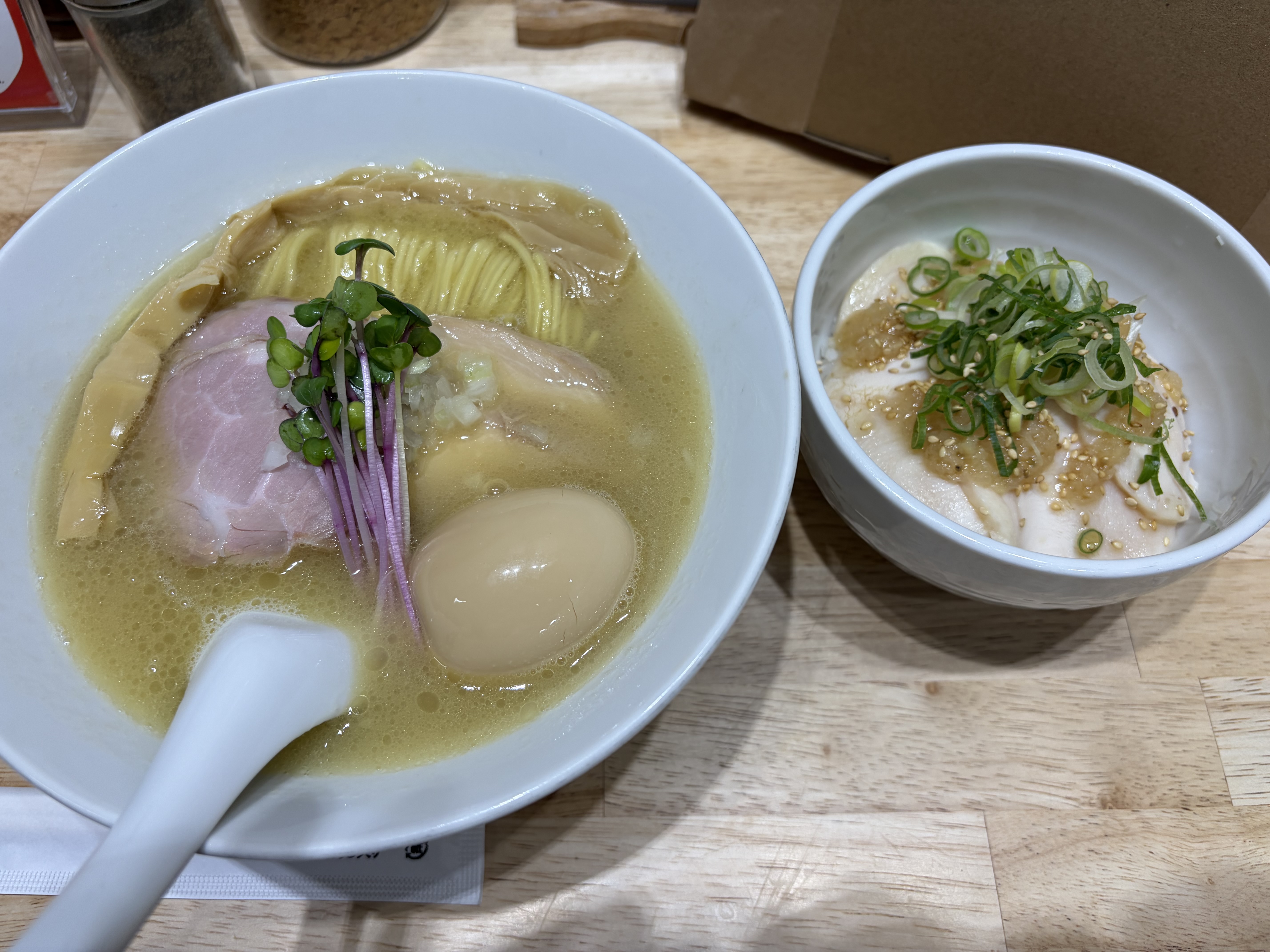 鶏白湯ラーメンで、静かに満たされる夜 この日の一杯は、透き通るような黄金色のスープが印象的な鶏白湯ラーメン。見た目からして重たさはなく、むしろ澄んだ上品さを感じる。 まずスープをひと口。鶏の旨味がじんわり広がり、余計な脂の主張はない。濃厚なのに後味は軽く、レンゲが止まらないタイプ。 麺は中細ストレート。スープとの絡みが良く、すすったときの一体感が心地いい。低温調理のチャーシューはしっとり柔らかく、味玉は程よい半熟で、全体のバランスを崩さない名脇役。