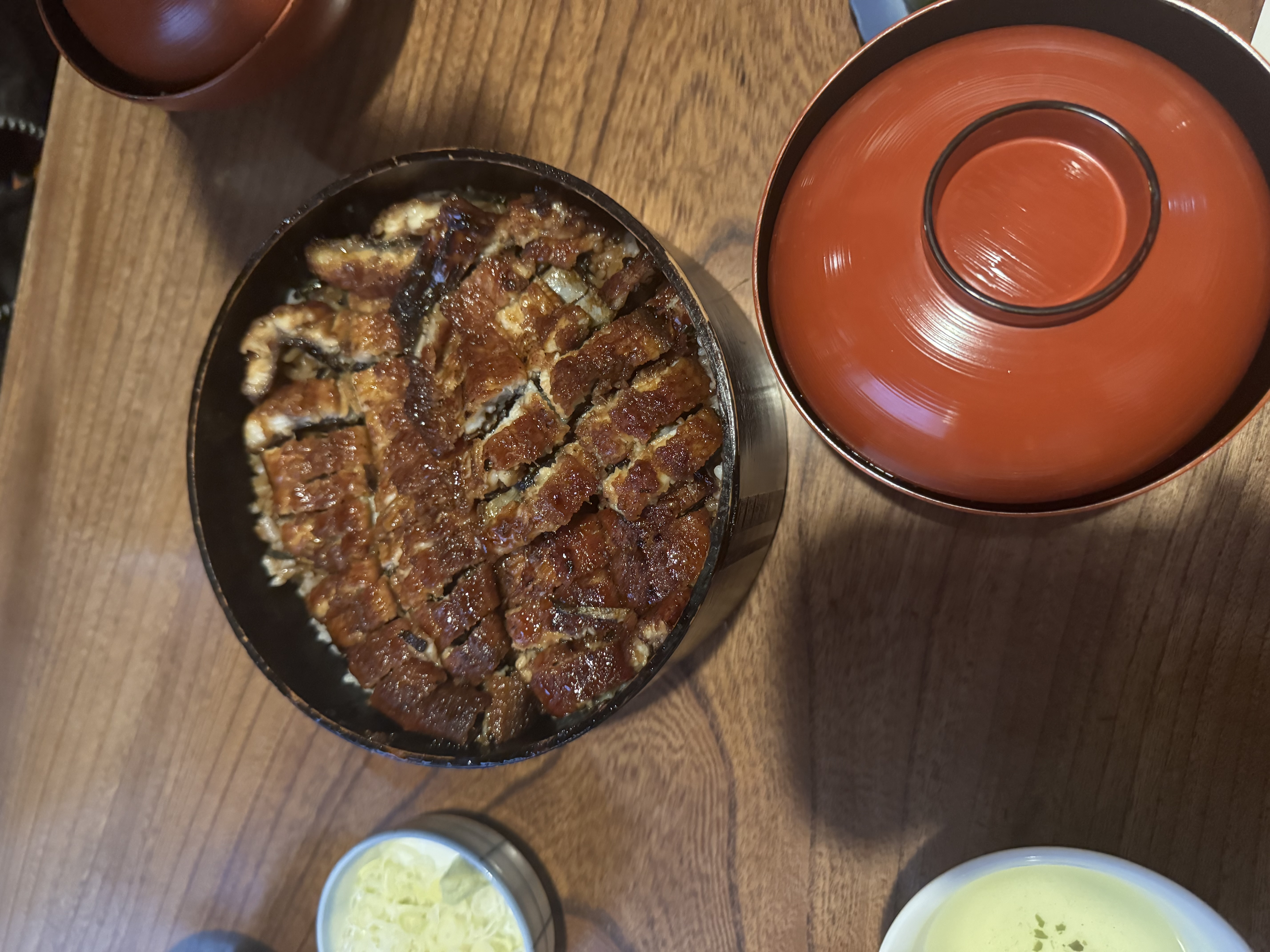 今日、うなぎの名店へ。 木の温もりあるテーブルに運ばれたのは、ふっくら香ばしいうなぎが山盛りの丼。秘伝のタレが染み、蒲焼きは外カリ中トロ。ご飯に絡む甘辛さが絶妙! 脇には山椒の効いた肝吸いと、さっぱり漬物。 蓋付きの赤い椀は熱々のお吸い物。 一口ごとに幸せが広がる、至福の鰻重ランチでした! おいしかったぁ!!