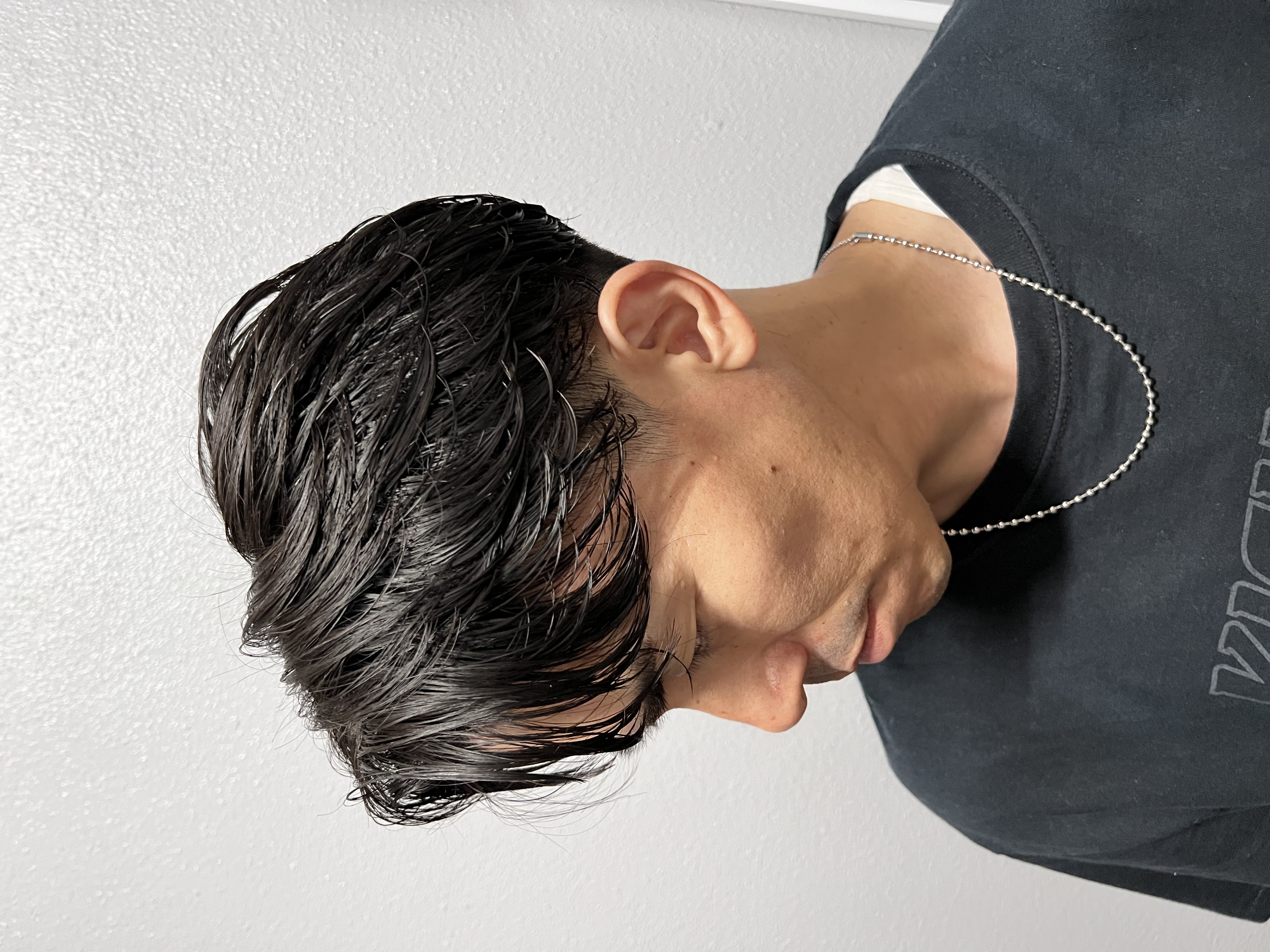 ナチュラルセンターパートを綺麗に見せるポイントは、前髪の割れ方とトップのボリュームバランス。直毛のままだとペタッとしてしまいがちですが、ほんのりパーマをかけるだけで自然な丸みと動きが加わり、軽やかさが生まれます。パーマと言っても強くかける必要はなく、クセ毛風のゆるめなカールで十分。乾かすだけで形が決まりやすくなるため、忙しい朝でもセットが簡単になります。こうした自然な動きは、メンズカットのベースがしっかりしているからこそ綺麗に活きます。