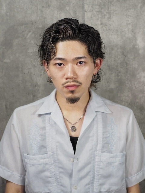 基底是俐落的雙層次(Two Block),讓整體更清爽、不顯厚重,再搭配強烈的螺旋捲,立即提升立體感與時尚感。在休閒或派對場合,可以隨意抓散,展現張揚又帥氣的存在感。而在商務場合,只要用髮油或髮膠往後梳,就能營造出乾淨俐落又充滿男子氣概的專業形象。