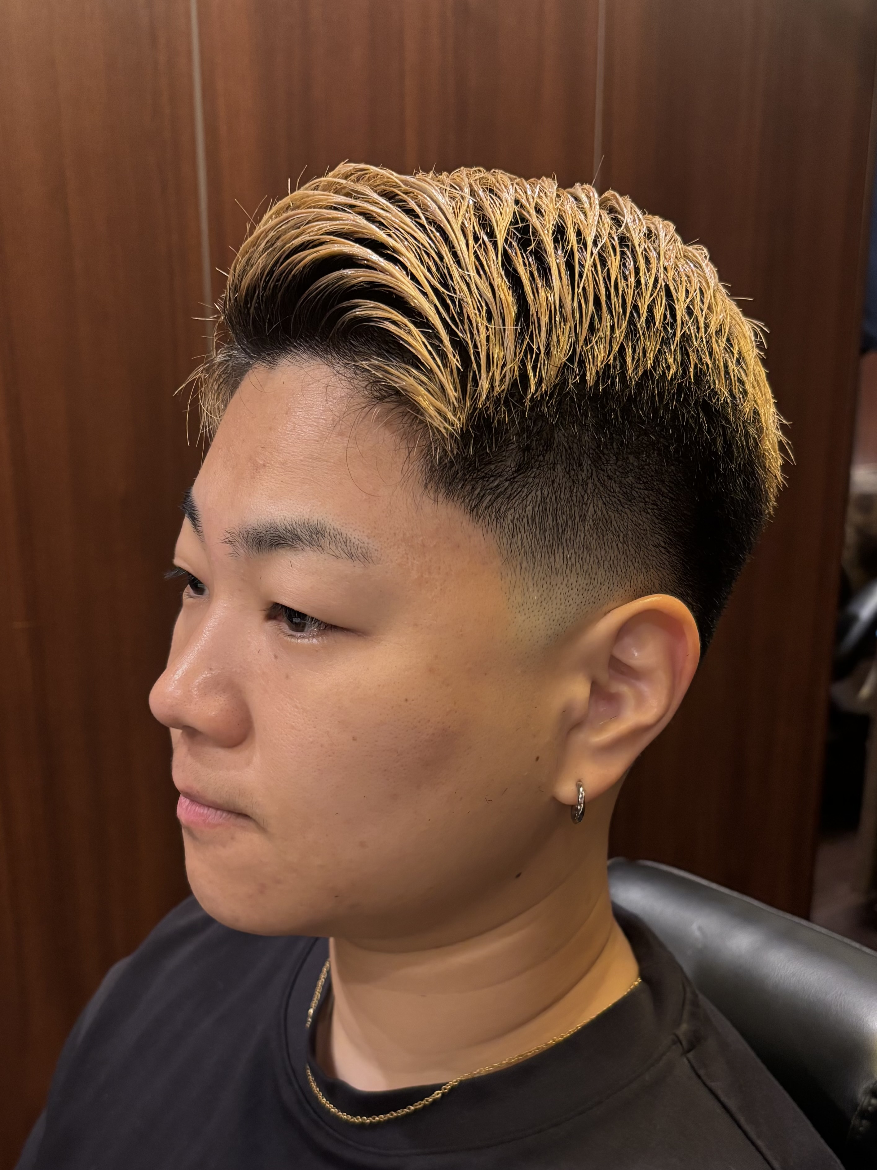 トップはハイトーンのブロンドで動きを出し、サイドは肌の透け感がきれいなスキンフェードで引き締めました。全体のシルエットをコンパクトにまとめることで、清潔感とトレンド感を両立。セットはグリースやジェルでタイトにまとめても、ドライな質感でラフに流してもOK。爽やかさの中に男らしさをプラスした、ビジネス・プライベートどちらにもハマる万能スタイルです。