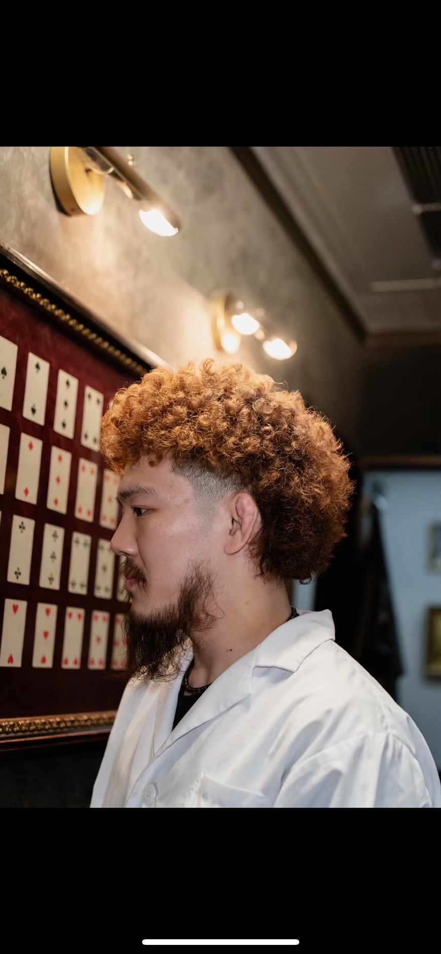 アフロパーマは扱いが難しそうなイメージを持たれがちですが、実は日々のスタイリングはシンプル。洗髪後に水分をしっかり残した状態で、ムースやクリーム系のスタイリング剤を揉み込むだけで、カールの立体感が自然に出ます。ハイトーンカラーと組み合わせることで、カール一つひとつの動きが強調され、写真のような奥行きのある表情に仕上がります。
