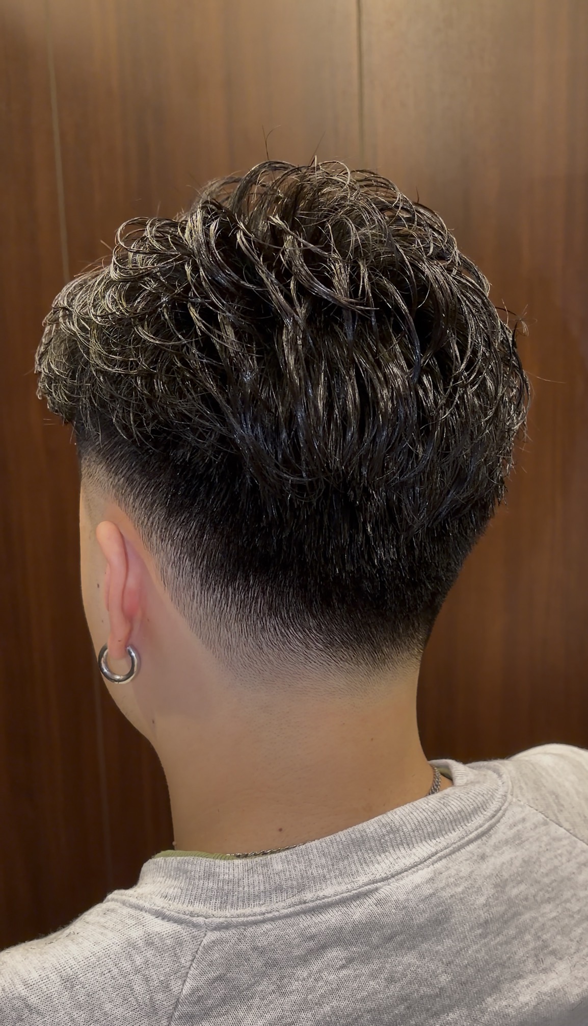 低めの位置から自然につなげたローフェードに、トップはパーマで動きをつけたスタイルです。 フェードの主張を抑えつつ、パーマの柔らかい質感を活かしたバランスの良い仕上がりに。ナチュラルながらも雰囲気の出るデザインです。 パーマをかけることで、直毛の方でも立体感が出やすく、毎朝のスタイリングも簡単になります。 ワックスやムースを軽く揉み込むだけで、自然な束感と動きが再現できます。 派手すぎず、扱いやすいパーマスタイルをお探しの方におすすめです。