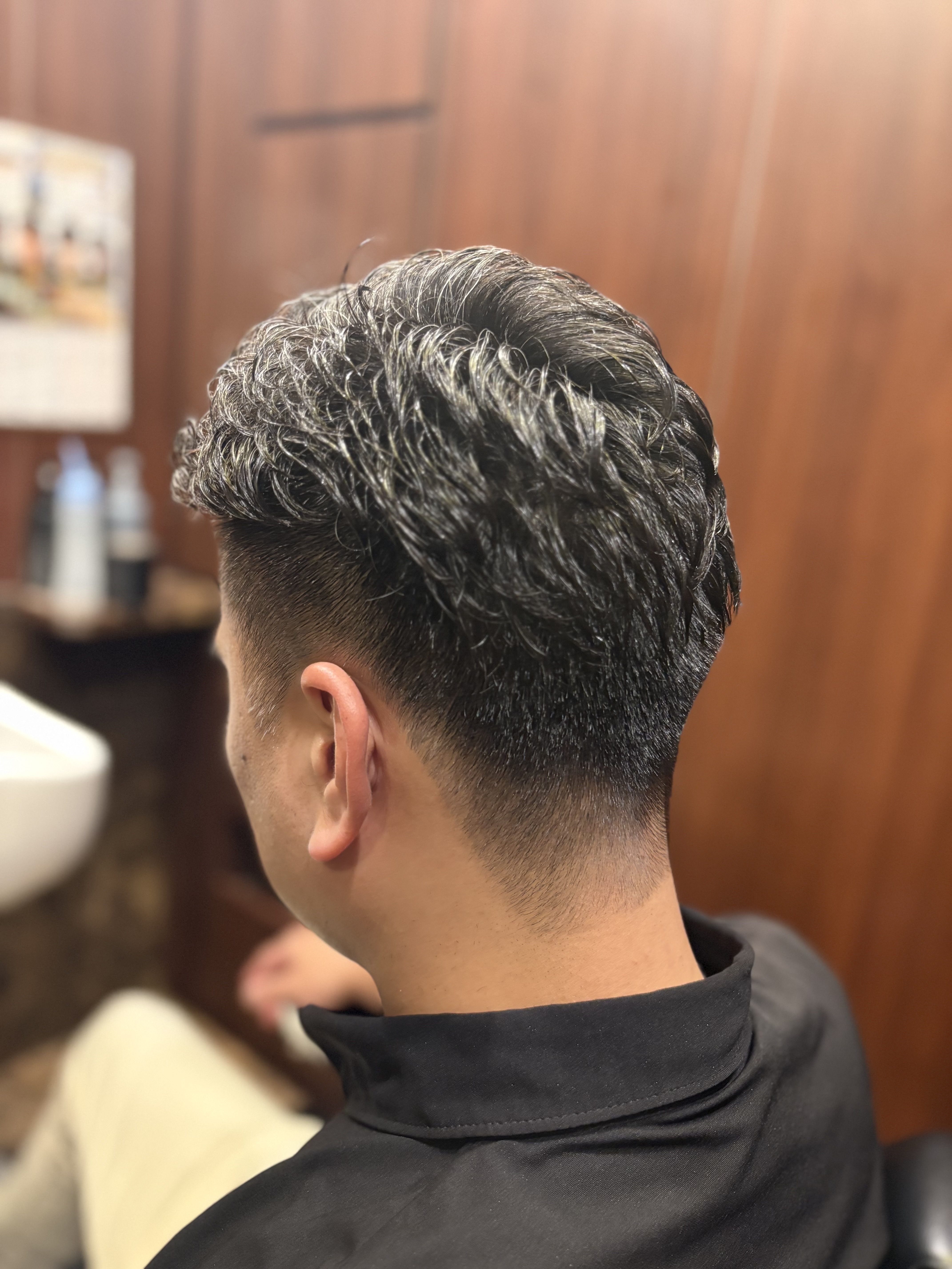 今回のスタイルは、襟足からサイドにかけて綺麗なグラデーションを作るフェードをベースに、トップは自然な動きが出る長さを残したバランスの良い仕上がりです。フェードは「伸びてきたときに形が崩れやすい」と思われがちですが、骨格や毛流れを見極めたメンズカットを行うことで、持ちもよく扱いやすいスタイルになります。朝のセットもワックスを軽くなじませるだけで形になり、忙しいビジネスシーンにもぴったりです。