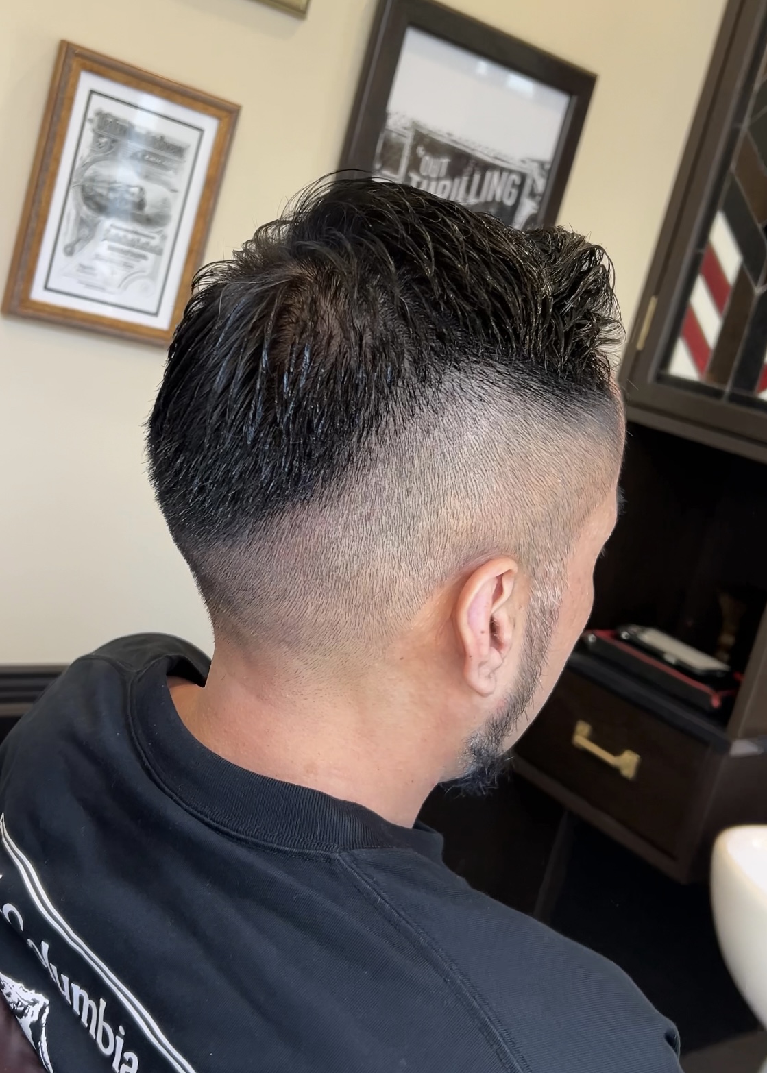 スキンフェードはサイドから襟足にかけて地肌が見えるレベルから自然にぼかし上げることで、引き締まった印象を演出。無駄のないシルエットが大人の余裕と清潔感を際立たせます。