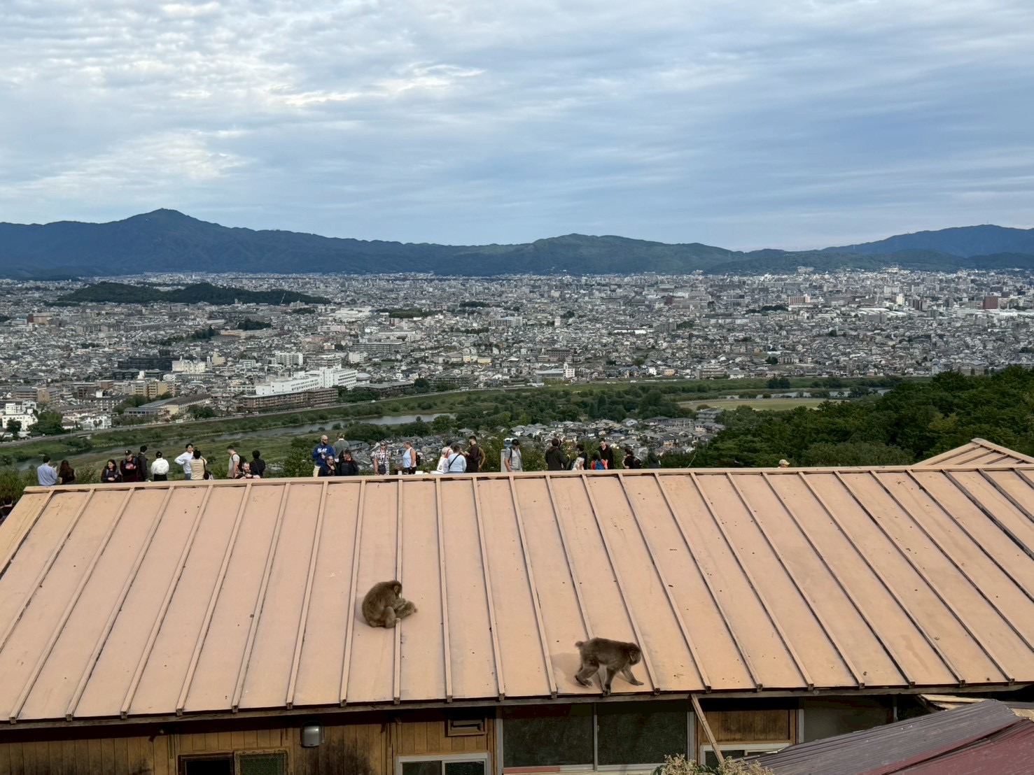 京都の街を一望できる絶景と、たくさんのサルたちが出迎えてくれました。