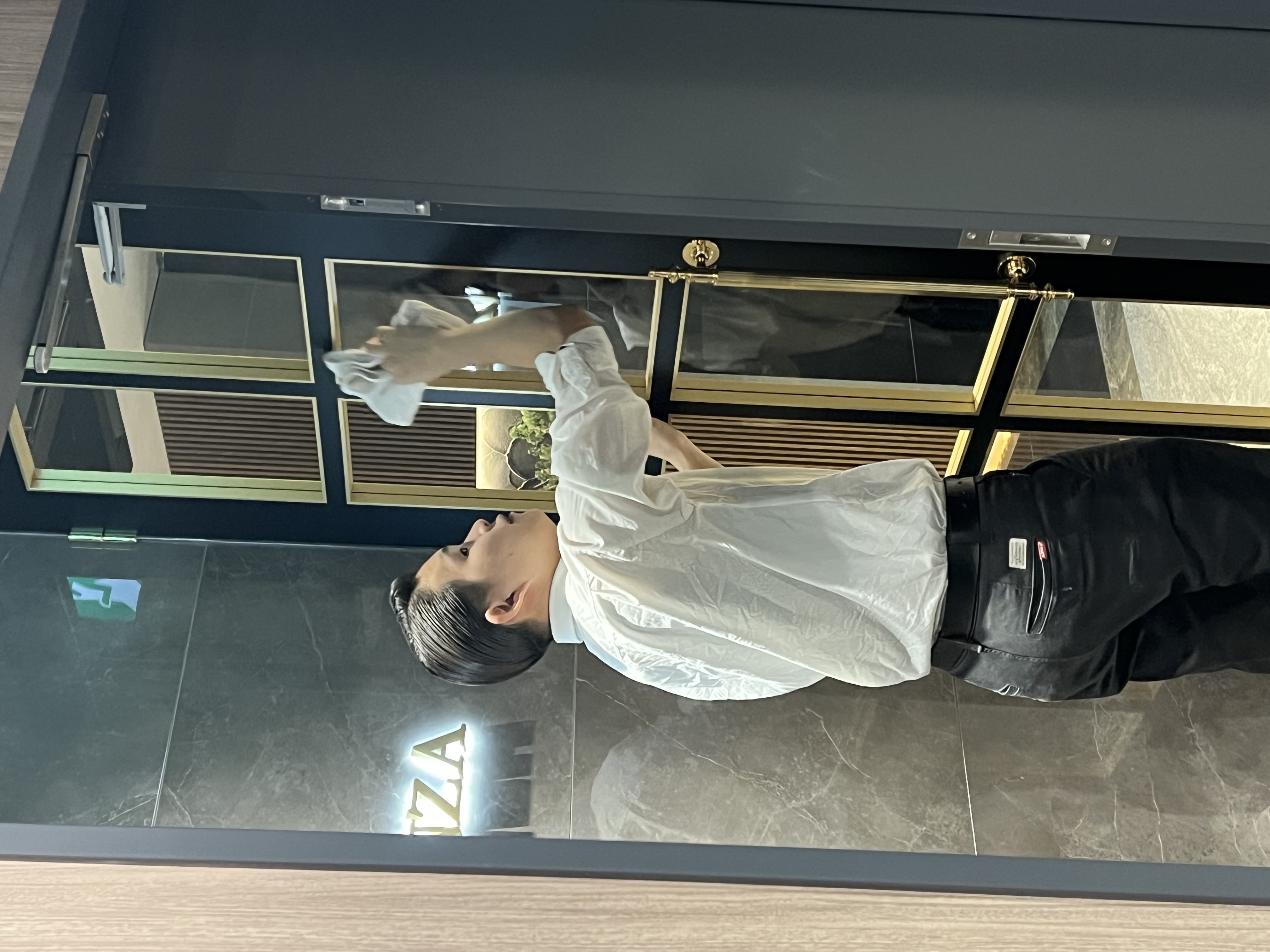 お客さまに最高の時間を過ごしていただくため、当店では空間づくりにも徹底してこだわっています。写真のように、オープン前にはスタッフが一枚一枚ガラスを磨き、清潔で気持ちのいい入口を整えるところから一日がスタート。店内は落ち着いた雰囲気で、リラックスできる空間をご用意しています。初めての方でも安心してお越しいただけるよう、丁寧で温かい接客を心がけています。ふと一息つきたくなった時、自分へのご褒美時間を過ごしたい時は、ぜひ当店へ。皆さまのお越しを心よりお待ちしております。