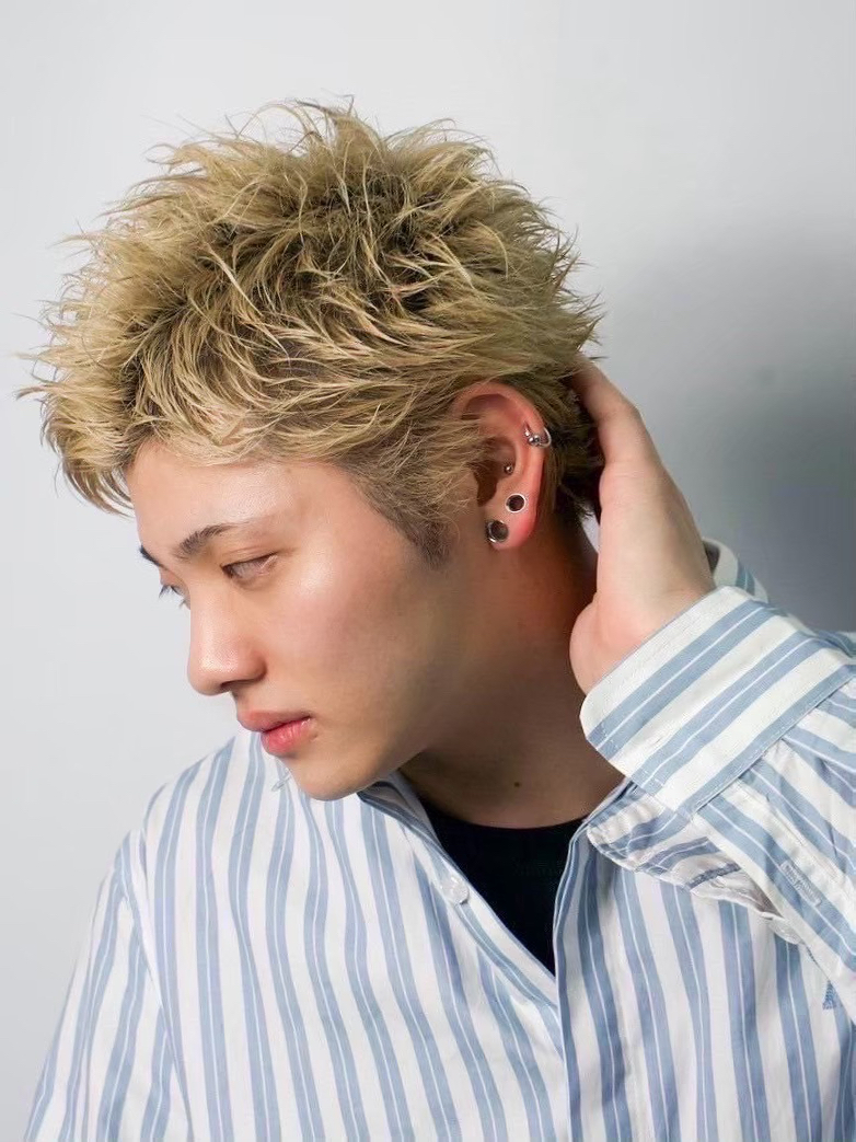 ヒロ銀座 御茶ノ水店では、男性の髪質に合わせたブリーチ施術と、骨格補正カットを組み合わせることで、自然な立ち上がりと動きを実現。トップを軽く立ち上げたスパイキーショートは、清潔感がありながらも程よく男らしい印象に仕上がります。
