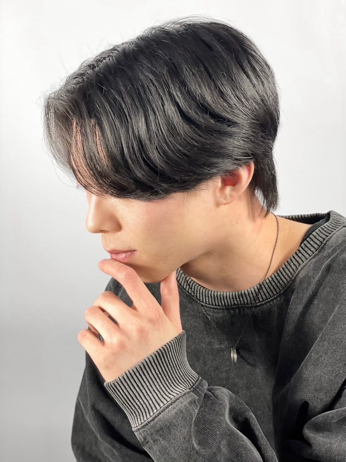 秋のファッションに合わせて、“少し大人っぽい雰囲気”を求めるなら、後ろを刈り上げないナチュラルセンターパートがおすすめ。軽すぎず重すぎない絶妙なバランスが魅力です。