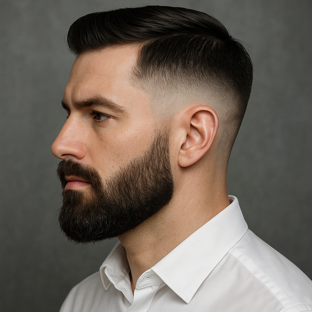 髭の輪郭とフェードのグラデーションが自然に繋がることで、顔全体に立体感が生まれます。