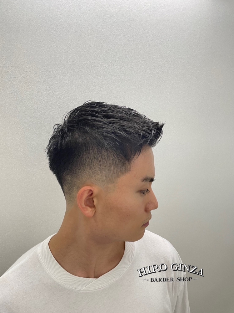 サイドをすっきり刈り上げ、トップを長めに残すことで、オン・オフどちらでも楽しめるスタイル。