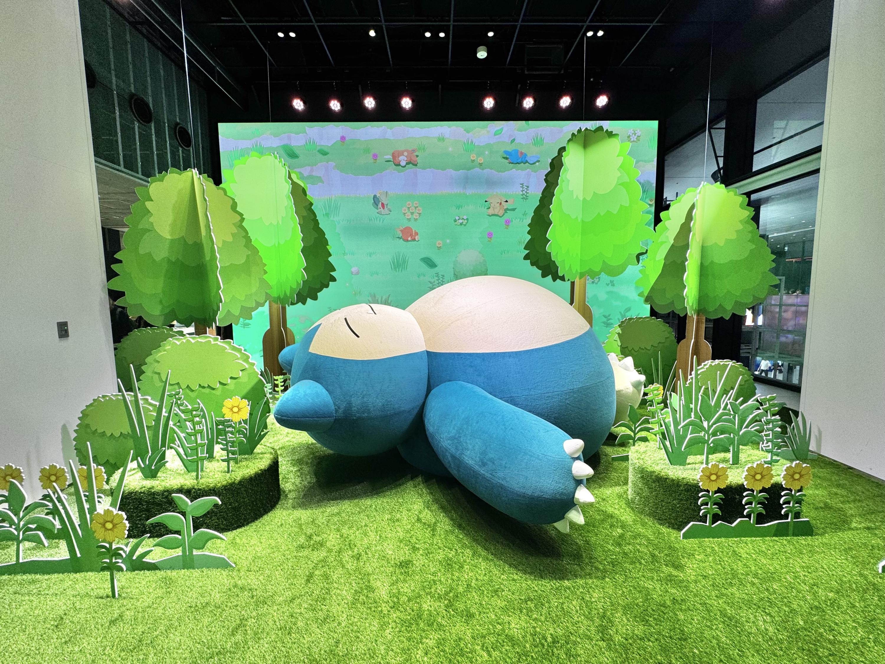 展示の中央には大きなカビゴンがいて、その存在感はまるで癒しのシンボル。子どもたちが隣で笑顔を見せる瞬間を撮ると、眠たげなカビゴンと元気な笑顔の対比がとても可愛らしく、一枚の写真に夏の空気が詰まったようでした。