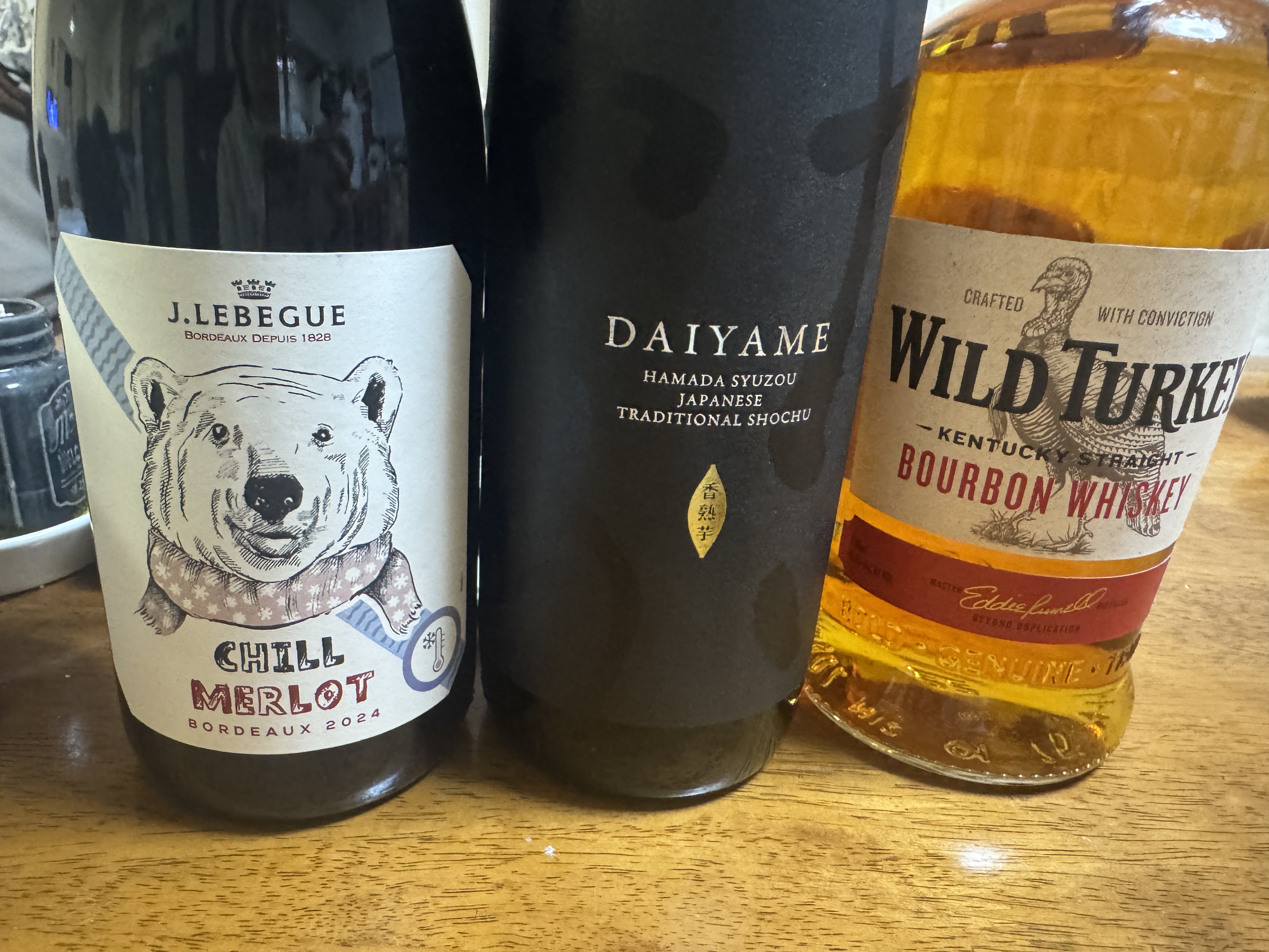 左から赤ワイン、いも焼酎、ウイスキー