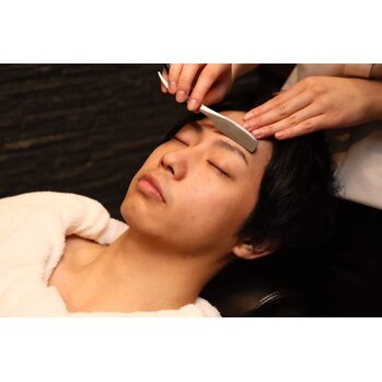 お顔剃りは、男性の第一印象を大きく変える“清潔感ケア”の基本です。髭とは別に、実はうぶ毛が顔全体に生えており、これがあるだけで肌がくすんで見えたり、化粧水が浸透しづらくなったりします。お顔剃りでは、この細かいうぶ毛をプロが丁寧に取り除き、肌の古い角質まで同時にオフしていきます。終わった後のつるんとした手触りと、ワントーン明るく見える肌に驚く方がとても多いんです。