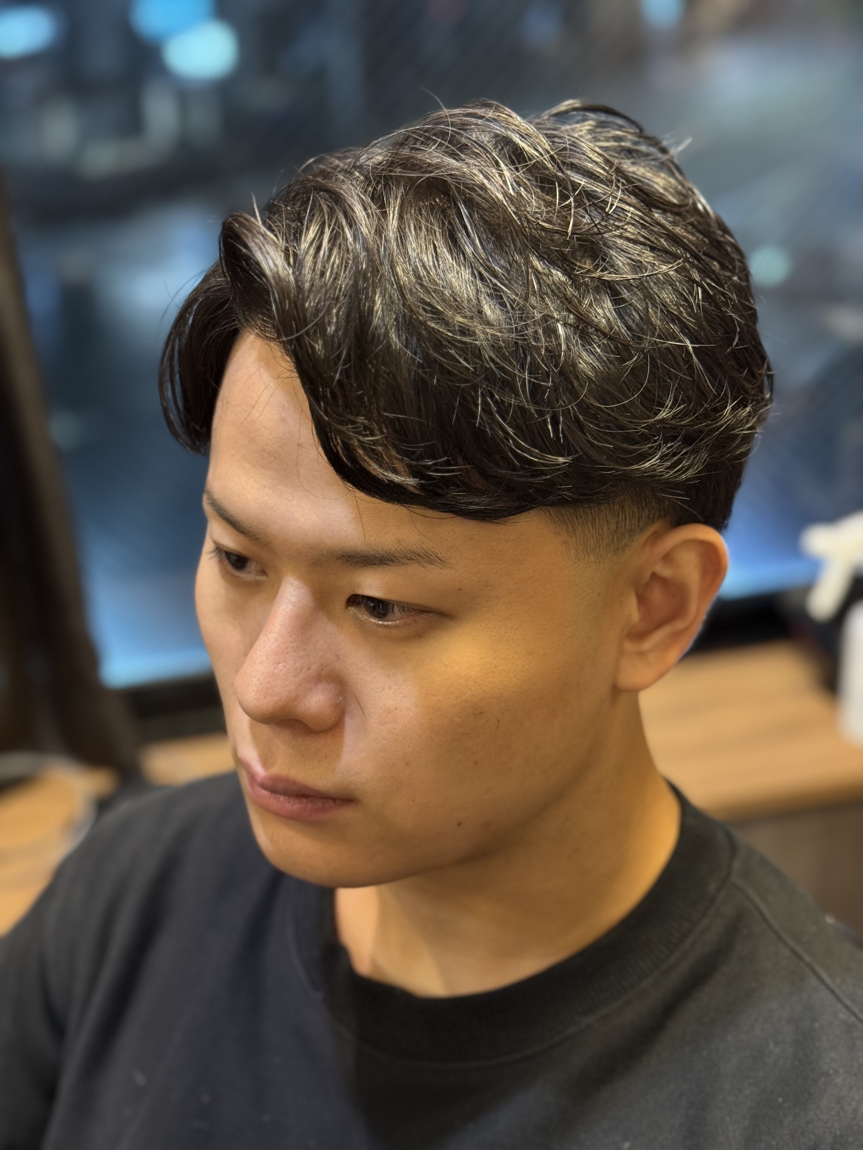 40代の男性におすすめなのは、強くかけすぎない「ナチュラルなビジネス向けパーマ」。トップにさりげなく動きを出すことで、冬特有のボリューム不足を解消し、横の膨らみは抑えながらバランスの良いシルエットに仕上がります。直毛で立ち上がりにくい方や、逆に広がってしまう髪質の方でも、パーマをかけることで扱いやすさが格段に向上します。スタイリング剤を軽くなじませるだけで整うので、忙しい朝にも負担がかかりません。
