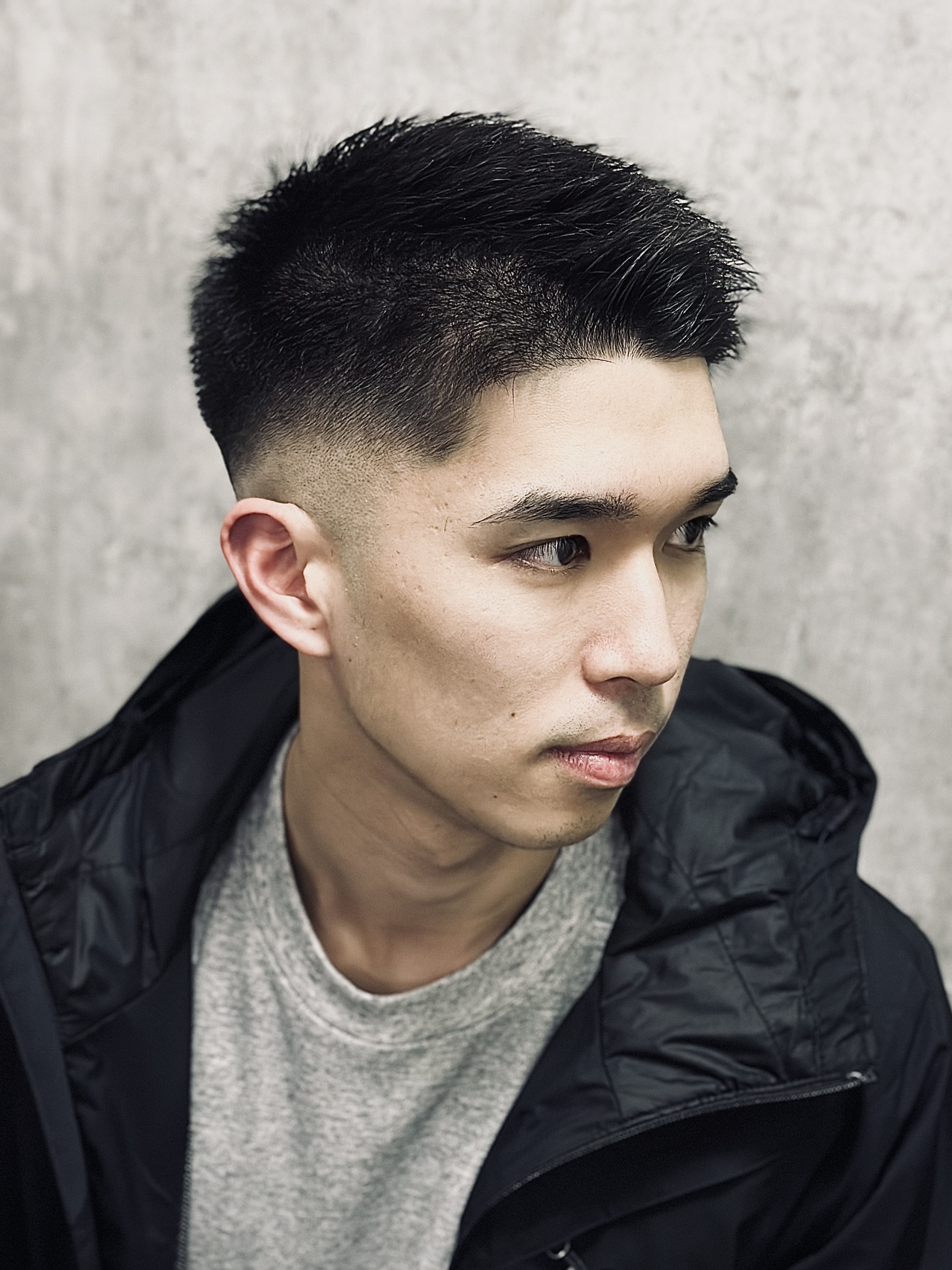特におすすめなのは、思い切り爽やかに仕上がるベリーショートのフェード。横や後ろをタイトに締めることで、頭の形がきれいに見え、トップのシルエットも自然に整います。髪が伸びても崩れにくく、毎朝のセット時間が短縮できるのも魅力です。さらに、秋冬はニットやコートなどボリュームのある服が増えるため、あえて短髪を合わせることで、逆に全体がスタイリッシュに見えます。まさに「アウターと合わせる」ことでより映える、季節にぴったりの髪型です。