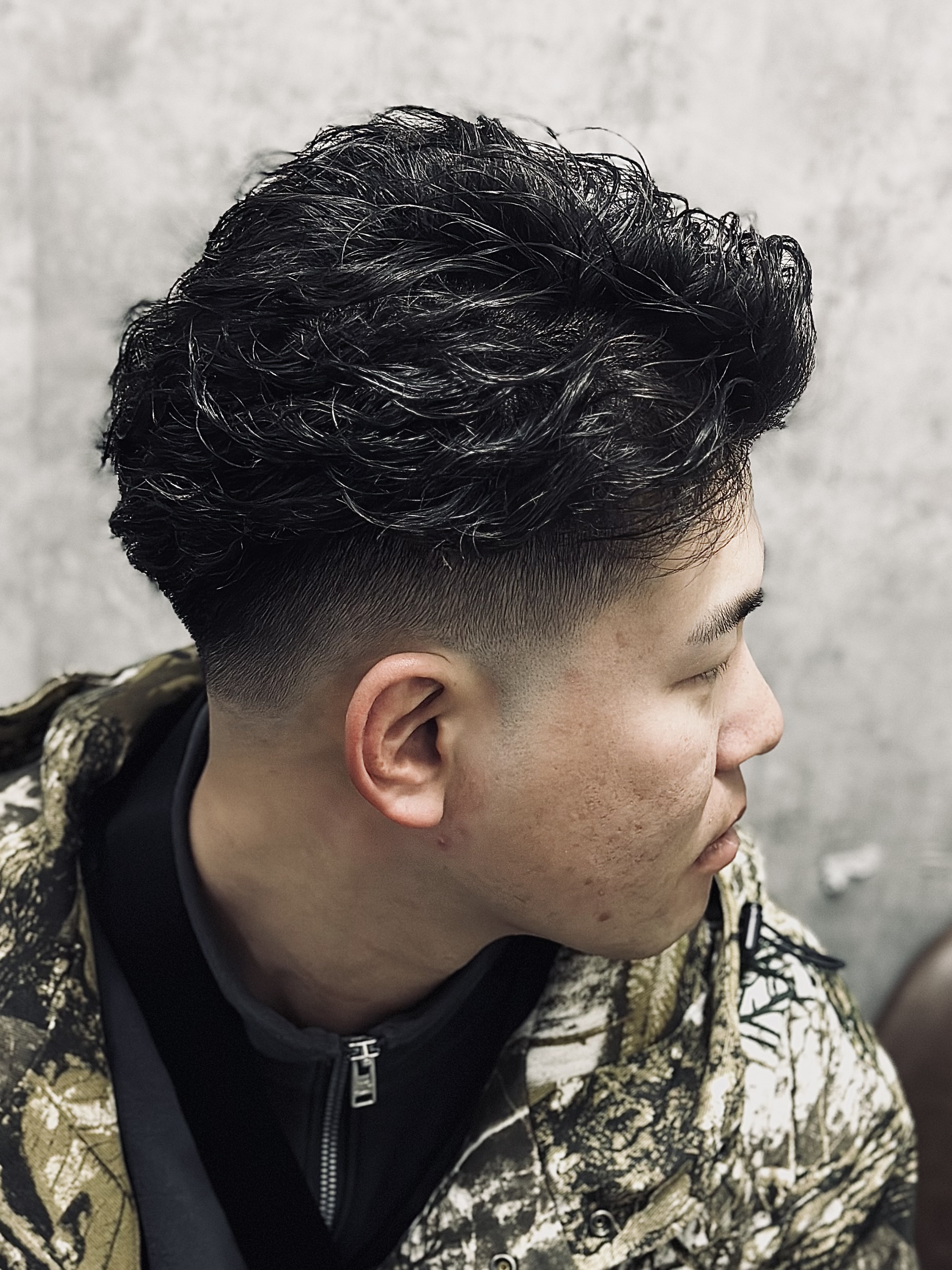 フェザーパーマは細かい後ろへの毛流れを作りやすく、無造作なのに清潔感がしっかり残るのが大きな特徴です。特に横や後ろが膨らみやすい方や、スタイリングに時間をかけたくない方におすすめ。乾かすだけで自然な動きが出るため、朝のセットがグッと楽になります。また、短めスタイルにも合わせやすく、実はフェードとも合わせられる万能パーマ。サイドを引き締めたフェードにトップの軽い動きが加わることで、バランスの取れたスタイルに仕上がります。オンオフ問わず整った印象をキープできるのも魅力のひとつです。