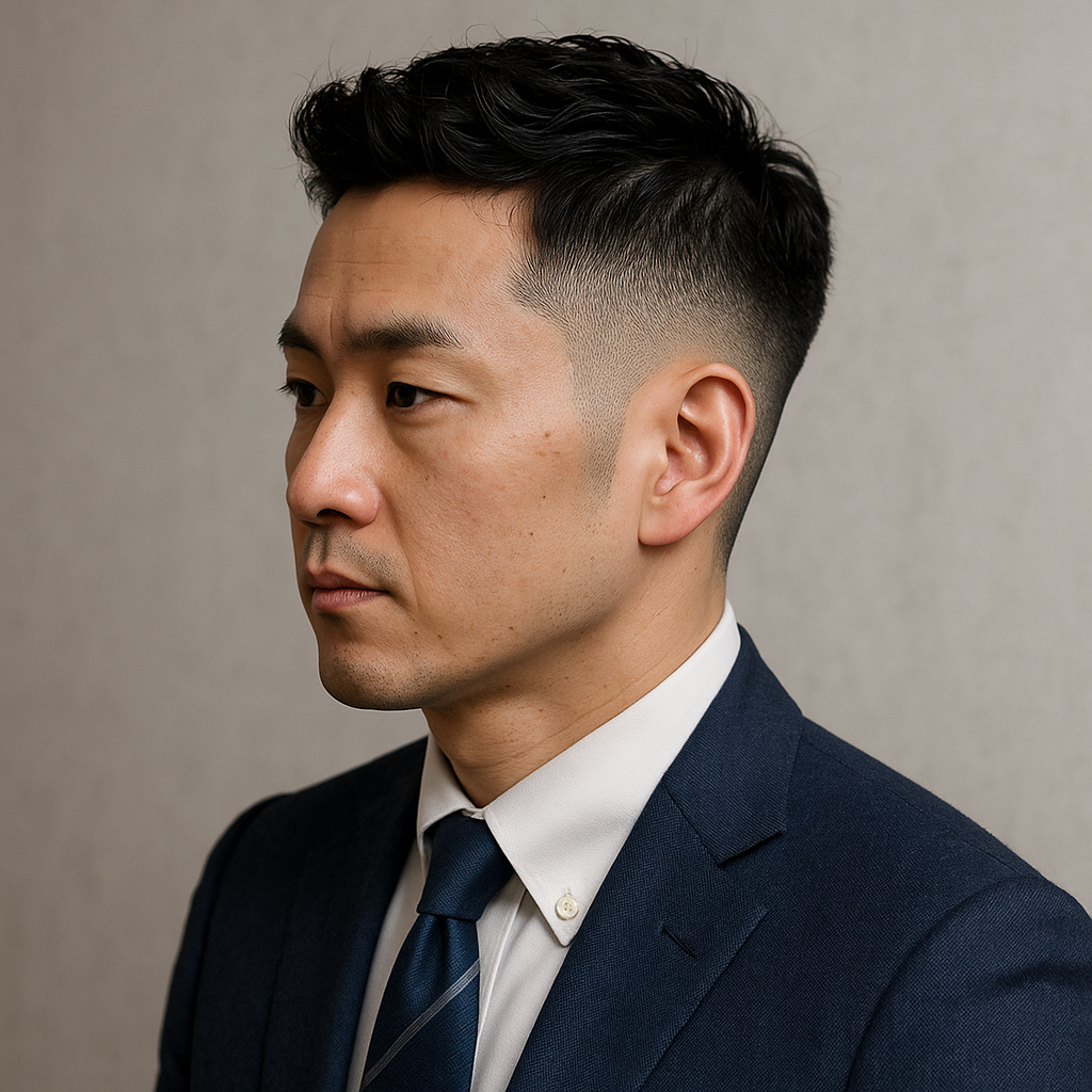 フェードカットは、サイドを短くグラデーションで刈り上げ、トップとの自然なつながりで立体感を生み出すスタイル。マフラーやスーツの襟にかかっても型崩れしにくく、長時間の外回りや出張でも清潔感を保ちやすいのが魅力です。朝のスタイリングも、ツヤのあるグリースやバームを少しつけるだけでOK。乾燥しがちな冬でも艶やかにまとまります。