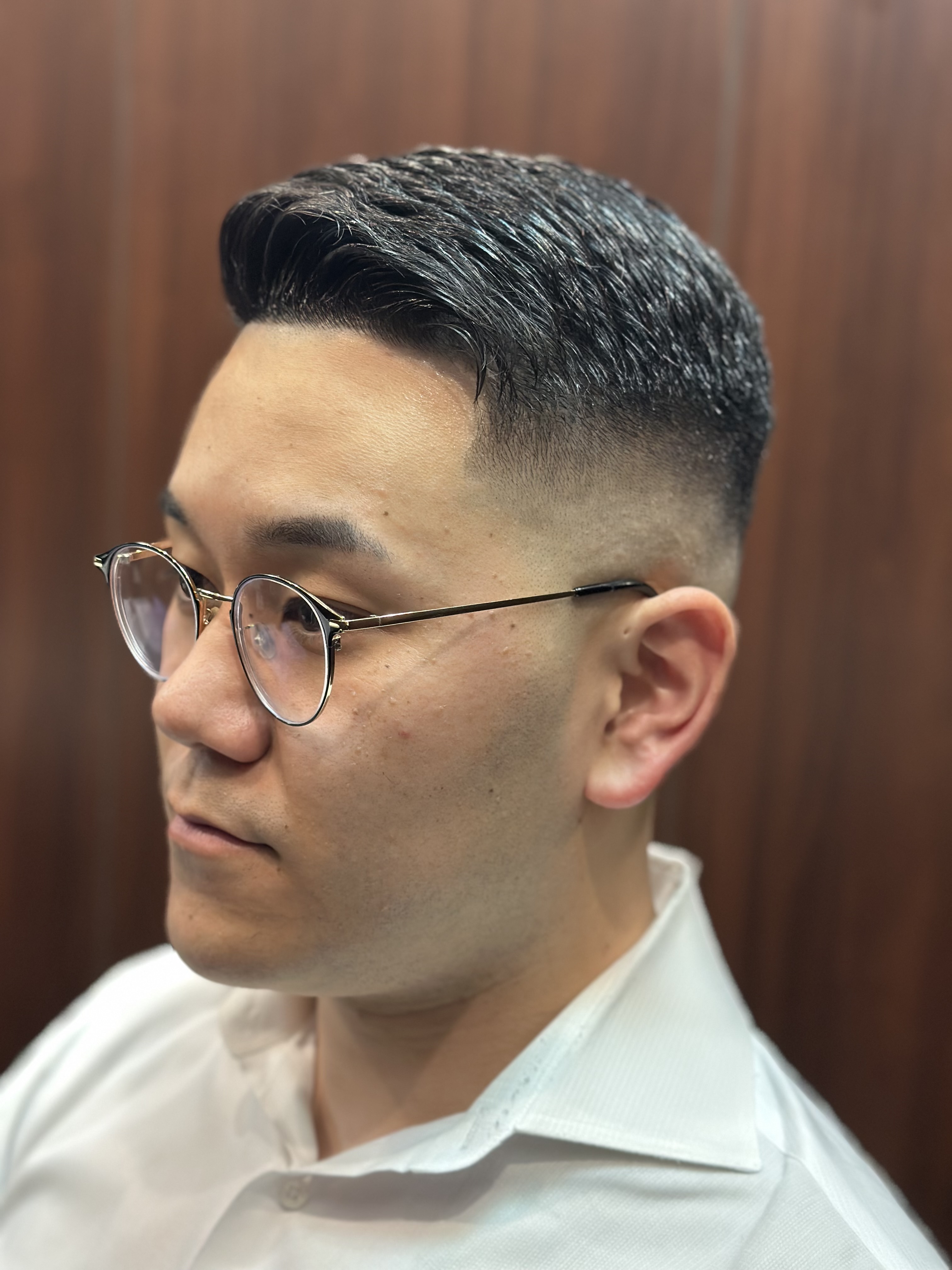 ヒロ銀座では、ただ短くするのではなく、その方にとって一番清潔感が出るフェードを意識しています。髪質や頭の形、普段のセット方法まで考慮して、無理のない似合わせをご提案します。理容室ならではのシェービングも組み合わせることで、髪型だけでなく顔まわりまで整い、全体の完成度が高まります。